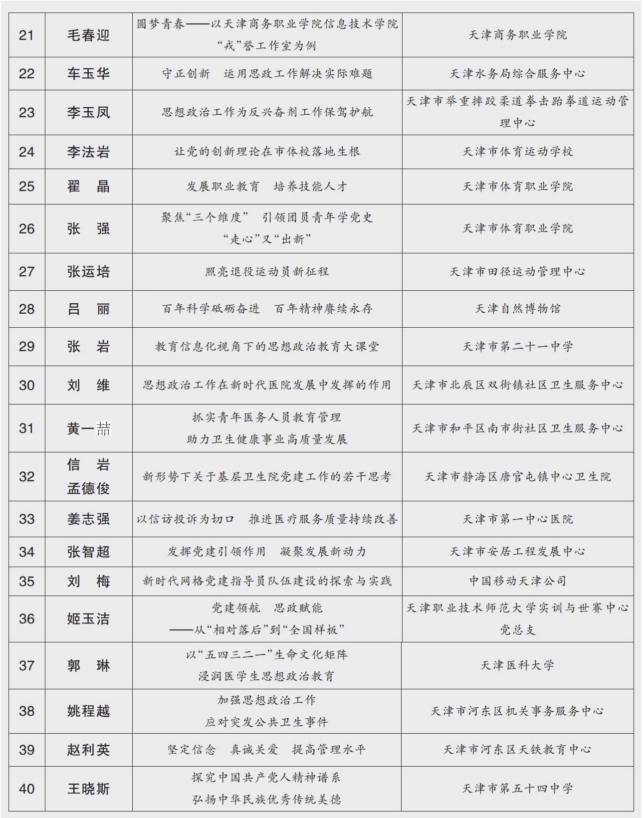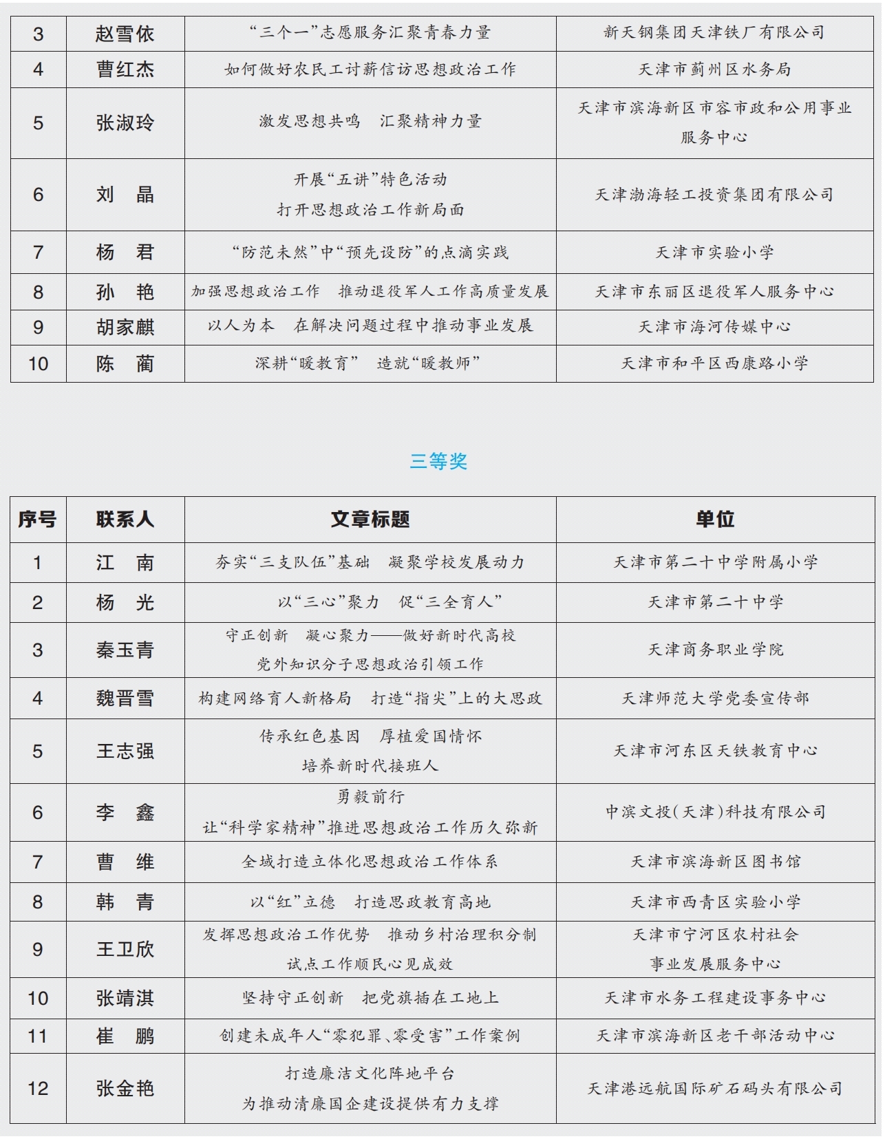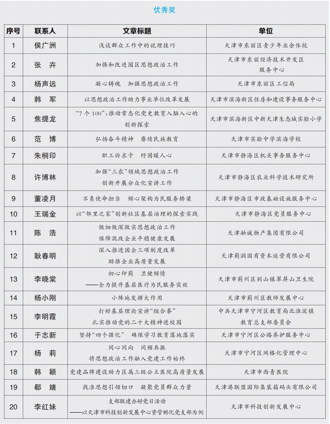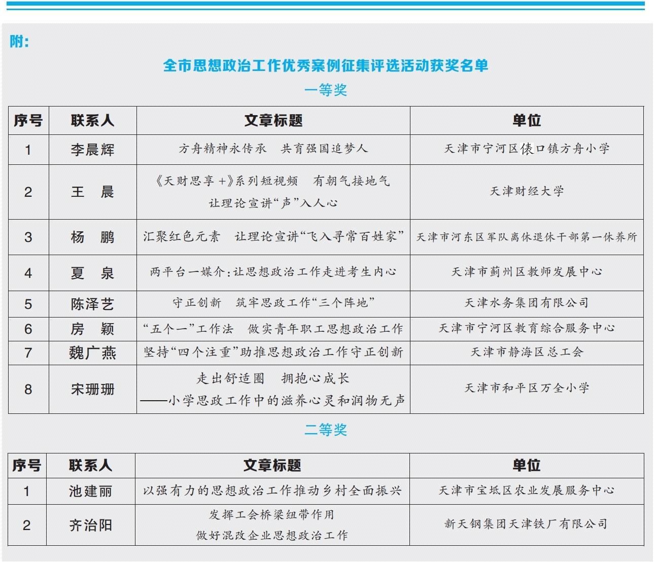 为深入学习贯彻习近平新时代中国特色社会主义思想和党的二十大精神,全面贯彻落实习近平总书记关于宣传思想工作的重要思想和中共中央、国务院《关于新时代加强和改进思想政治工作的意见》精神,充分展示党的十九大以来我市思想政治工作创新实践取得的优秀成果,发挥交流借鉴、示范带动作用,受市政研会、市政工职评办委托,市委支部生活社面向全市组织开展了思想政治工作优秀案例征集工作。来自全市机关、企事业单位、学校、社区等各单位踊跃投稿,经组织遴选、专家评审,此次活动共评选出一等奖8篇,二等奖10篇,三等奖12篇,优秀奖40篇。